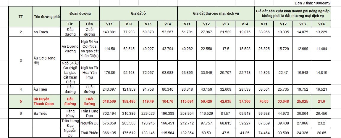 Trong đó, đoạn đường Bà Huyện Thanh Quan thuộc khu vực 1. Giá đất ở từ đầu đến cuối đường Bà Huyện Thanh Quan dao động từ khoảng 104 triệu đồng/m² đến 318 triệu đồng/m², cụ thể bảng giá đất đường Bà Huyện Thanh Quan Hà Nội 2026 như sau: