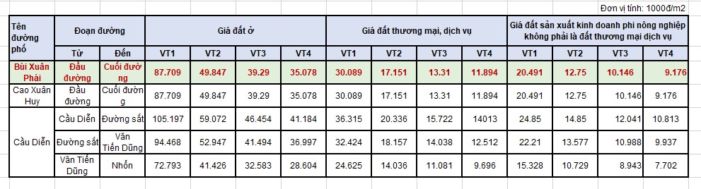 Bảng giá đất phố Bùi Xuân Phái quận Nam Từ Liêm (cũ) Hà Nội 2026