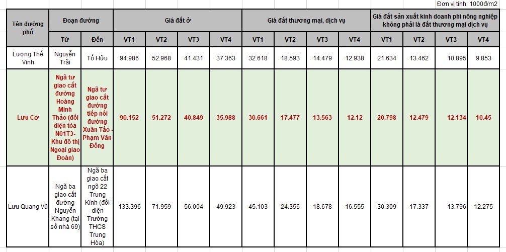 Bảng giá đất phố Lưu Cơ Hà Nội 2026