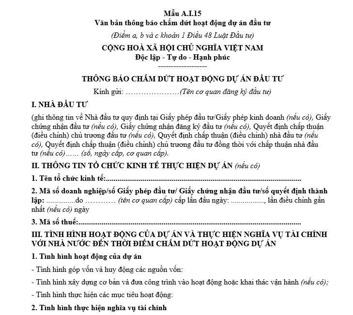 Mẫu A I 15 văn bản thông báo chấm dứt hoạt động dự án đầu tư mới nhất?