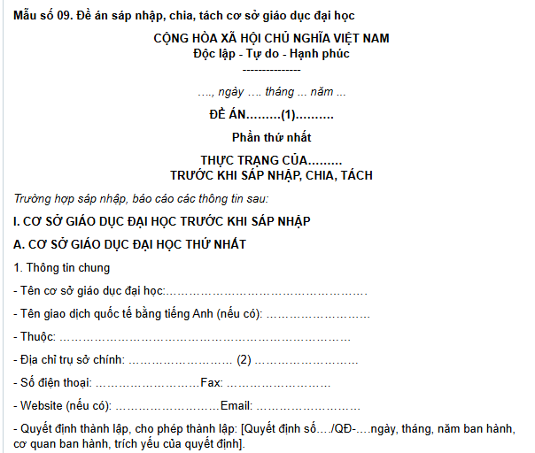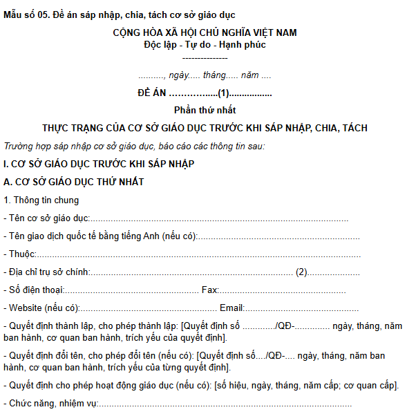 Mẫu đề án sáp nhập trường tiểu học, THCS, THPT, mầm non và đại học là mẫu nào?