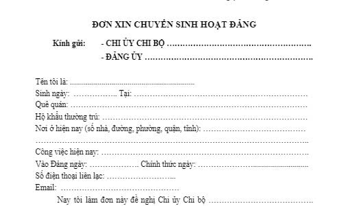Để thuận tiện cho việc công tác và sinh hoạt Đảng, nay tôi là đơn này kính đề nghị Chi bộ... Đảng ủy...cho phép tôi được chuyển đến sinh hoạt Đảng tại Chi bộ...thuộc Đảng ủy...: ghi rõ tên Đảng ủy, Chi bộ cũ và tên Đảng ủy, Chi bộ mới nơi sắp chuyển tới.