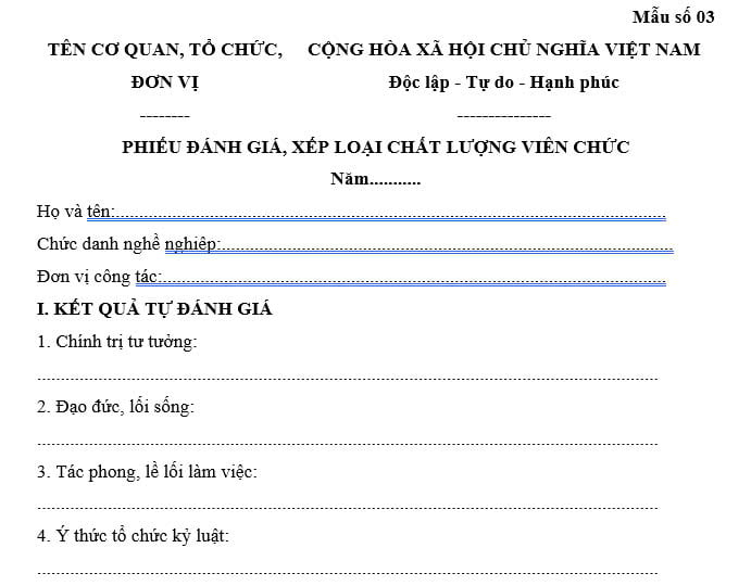 Mẫu phiếu đánh giá xếp loại chất lượng viên chức năm học 2025 giáo viên? Tải phiếu đánh giá xếp loại chất lượng viên chức mẫu số 03 cho giáo viên