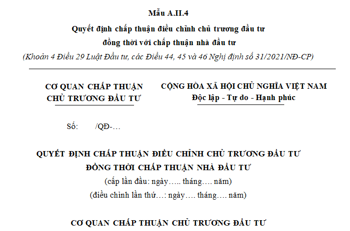 Căn cứ tại Phụ lục A ban hành kèm theo Thông tư 03/2021/TT-BKHĐT quy định mẫu A.II.4 là mẫu quyết định chấp thuận điều chỉnh chủ trương đầu tư đồng thời với chấp thuận nhà đầu tư mới nhất như sau: