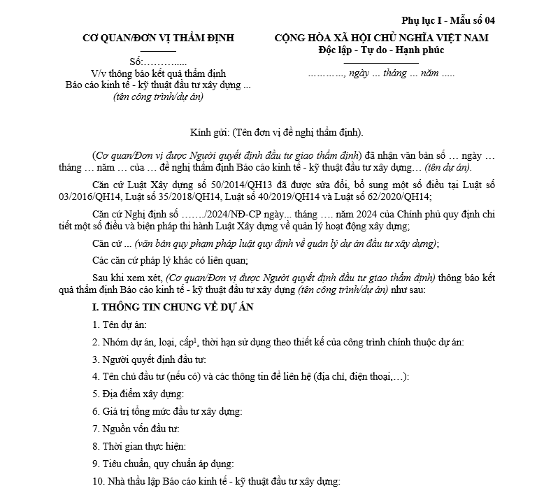 Căn cứ tại Phụ lục I ban hành kèm theo Nghị định 175/2024/NĐ-CP, quy định Mẫu số 04 là Mẫu Thông báo kết quả thẩm định Báo cáo kinh tế kỹ thuật đầu tư xây dựng 2025.