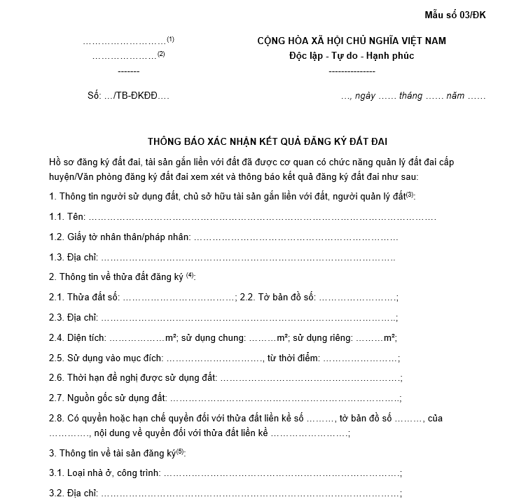 Mẫu số 03/ĐK mẫu thông báo xác nhận kết quả đăng ký đất đai có dạng như sau: