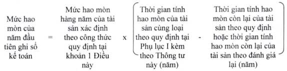 Riêng năm đầu tiên ghi sổ kế toán tại doanh nghiệp quản lý tài sản đường sắt (năm doanh nghiệp quản lý tài sản đường sắt tiếp nhận tài sản/năm thực hiện kiểm kê phát hiện thừa) thì mức hao mòn của tài sản được xác định theo công thức sau: