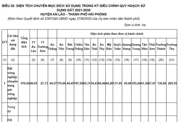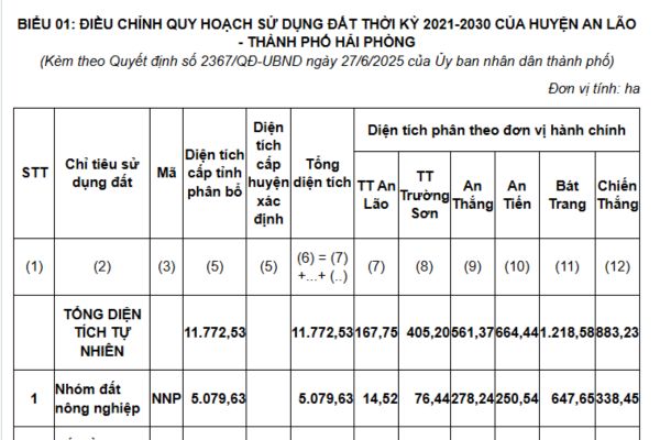 Ngày 27/06/2025, UBND TP Hải Phòng ban hành Quyết định 2367/QĐ-UBND năm 2025 phê duyệt điều chỉnh Quy hoạch sử dụng đất thời kỳ 2021-2030 huyện An Lão, thành phố Hải Phòng.