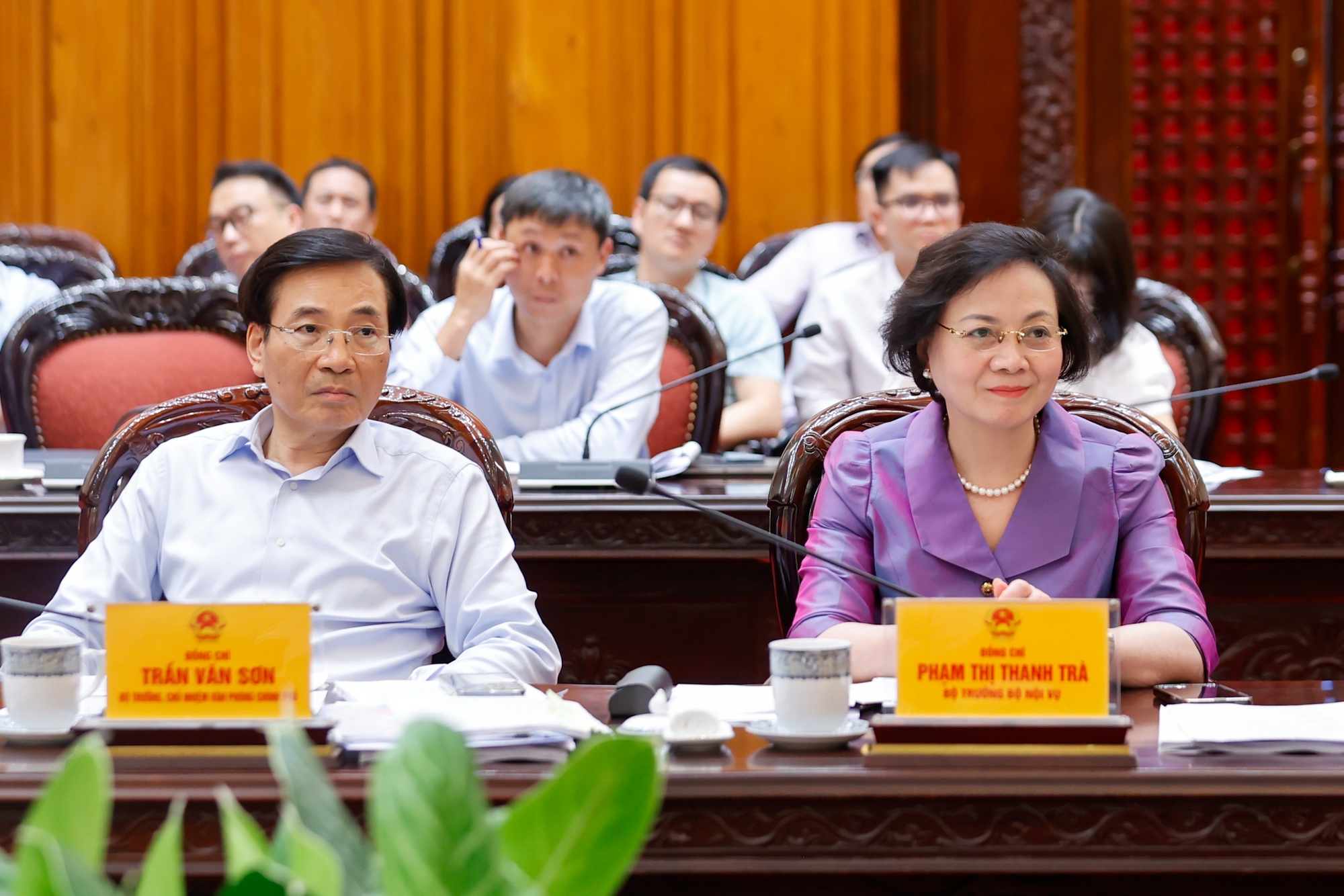 Bộ trưởng, Chủ nhiệm Văn phòng Chính phủ Trần Văn Sơn và Bộ trưởng Bộ Nội vụ Phạm Thị Thanh Trà dự và phát biểu tại phiên họp - Ảnh: VGP/Nhật Bắc
