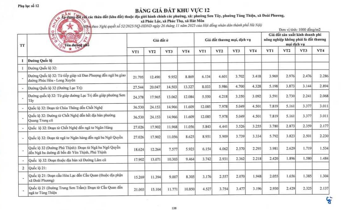 Trong đó, giá đất tại Xã Phúc Thọ thành phố Hà Nội từ 01/01/2026 chi tiết như sau: