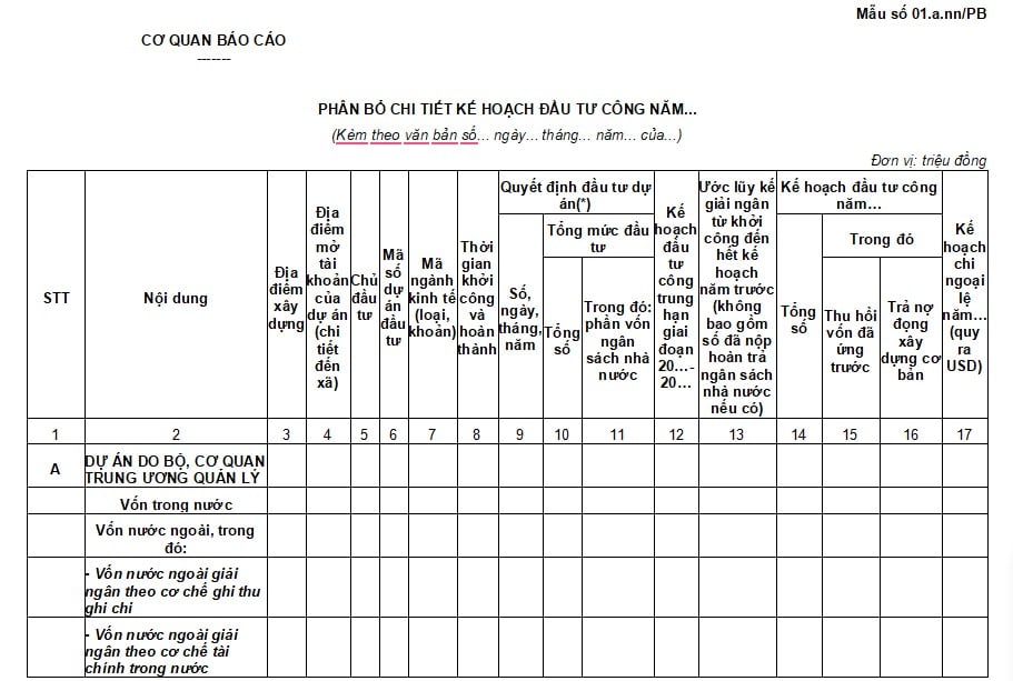 Mẫu số 01 a nn PB Phân bổ chi tiết kế hoạch đầu tư công năm áp dụng đối với dự án đầu tư công tại nước ngoài Tải về
