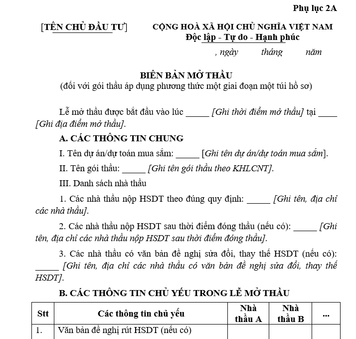 b) Phụ lục 2A: Biên bản mở thầu (đối với gói thầu áp dụng phương thức một giai đoạn một túi hồ sơ);