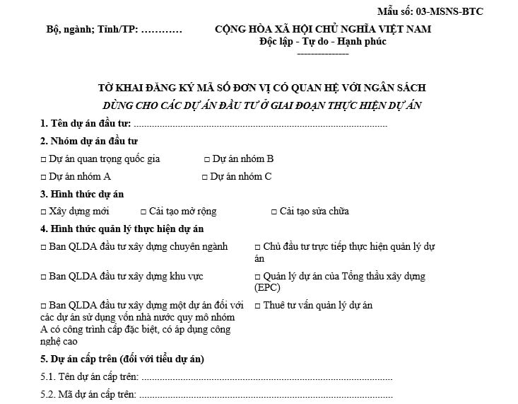 (1) Tờ khai đăng ký mã số ĐVQHNS dùng cho các dự án đầu tư ở giai đoạn thực hiện dự án theo mẫu số 03-MSNS-BTC đã nêu như quy định trên.