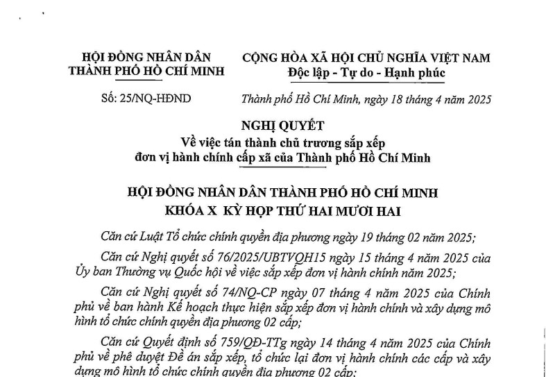 Ngày 18/4/2025, HĐND TPHCM đã thông qua Nghị quyết 25/NQ-HĐND 2025 TP HCM về tán thành sắp xếp đơn vị hành chính cấp xã.