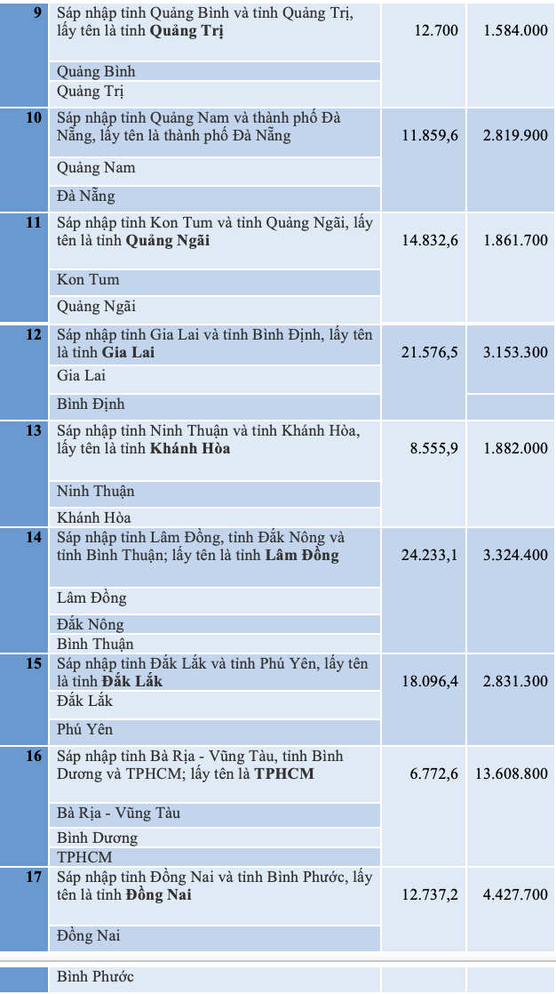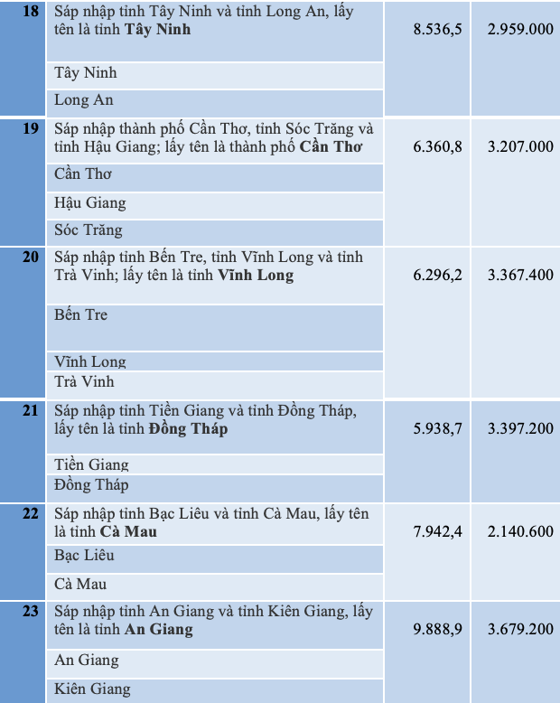 Trên đây là danh sách dự kiến tên gọi, diện tích, dân số của 23 tỉnh, thành mới sau sáp nhập và dự kiến 3 tỉnh, thành có diện tích nhỏ nhất sau sáp nhập.