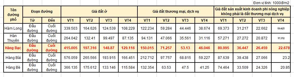 Bảng giá đất phố Hàng Bạc Hà Nội 2026
