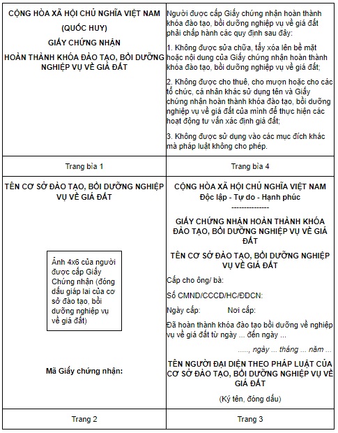 Căn cứ Phụ lục I kèm theo Thông tư 12/2024/TT-BTNMT ngày 31/7/2024 của Bộ trưởng Bộ Tài nguyên và Môi trường quy định giấy chứng nhận hoàn thành khóa đào tạo, bồi dưỡng nghiệp vụ về giá đất như sau: