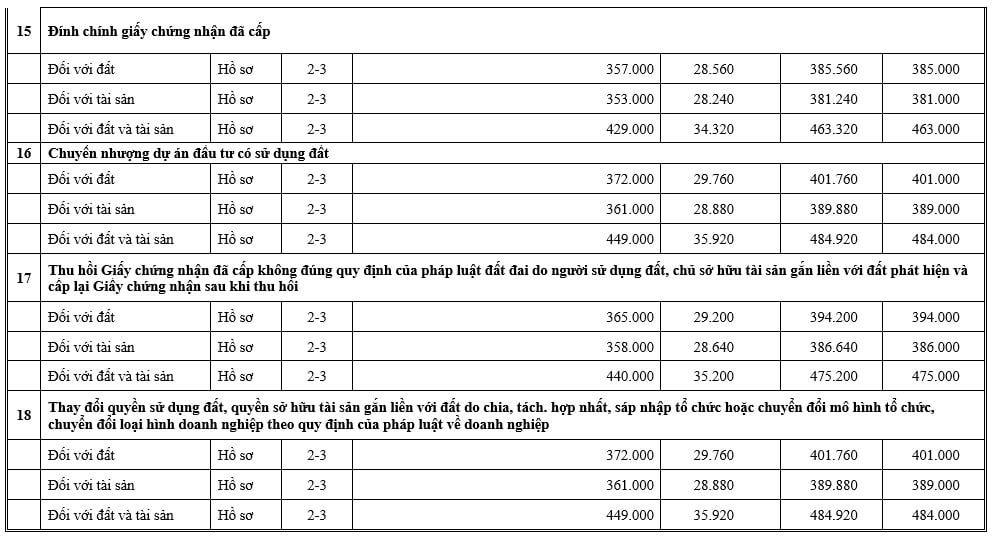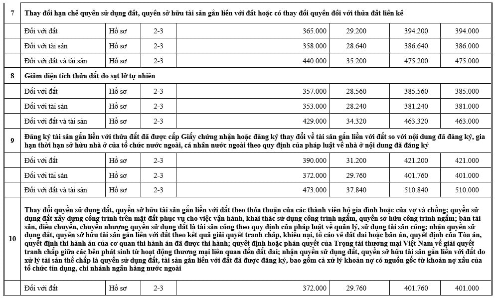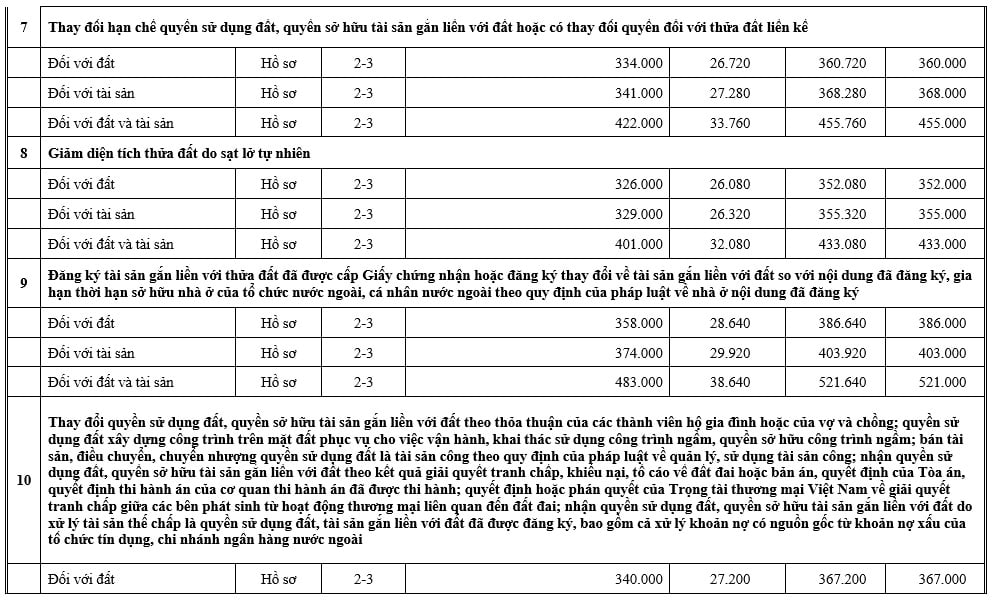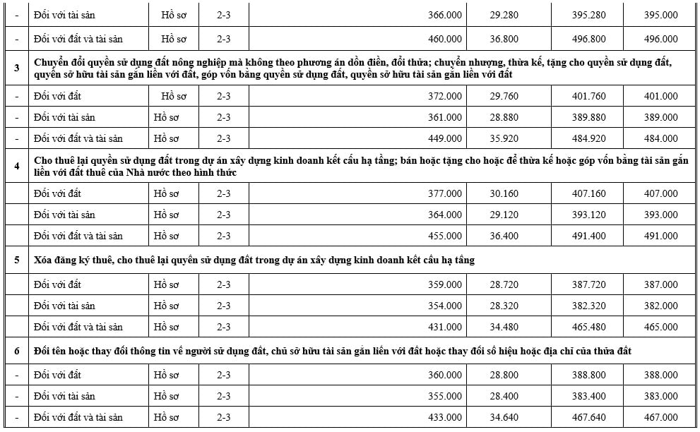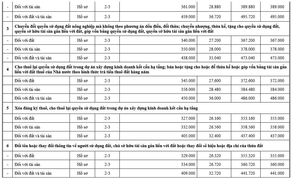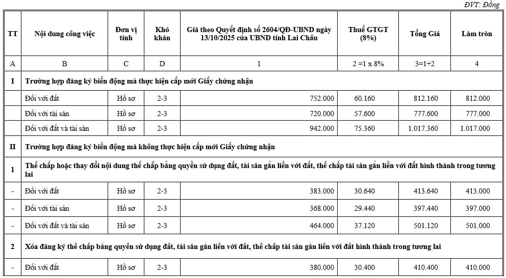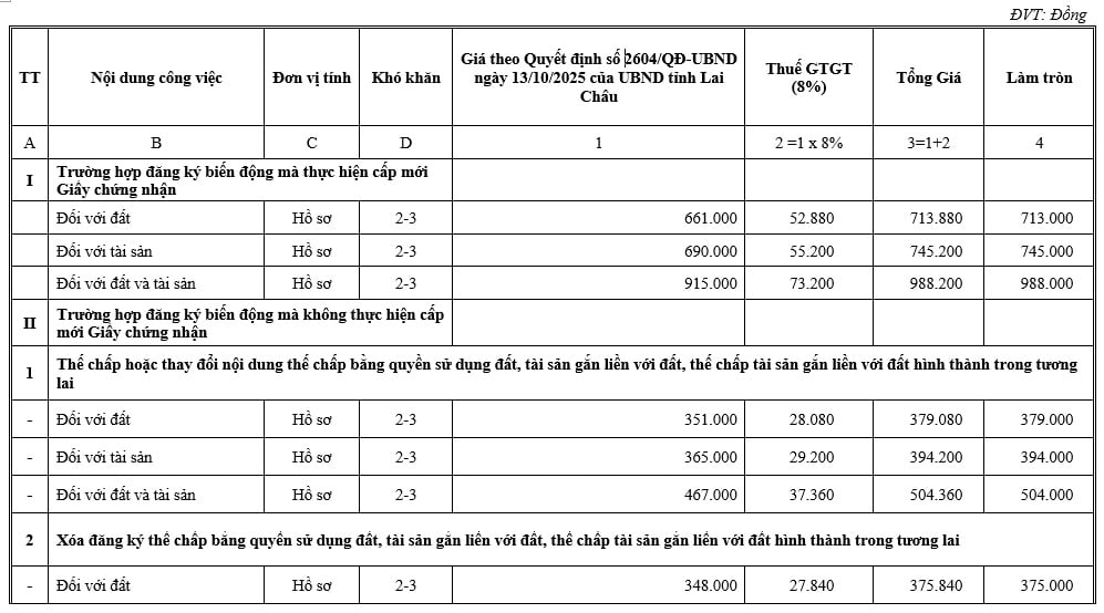 Tại Mục 3 và Mục 4 Phụ lục kèm theo Thông báo 559/TB-VPĐK năm 2025 đã công khai lệ phí đăng ký biến động đất đai tỉnh Lai Châu mới nhất như sau: